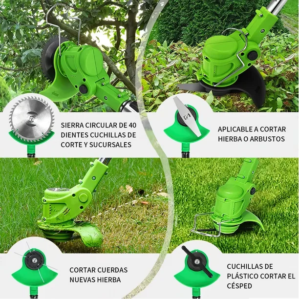 Una cortadora de césped, bordeadora y recortadora de césped inalámbrica todo en uno. Se convierte fácilmente de desmalezadora a cortadora de césped con ruedas. Con una rueda, el trabajo de desmalezado es tan fácil como caminar, mejora la eficiencia del trabajo y ahorra tiempo.
